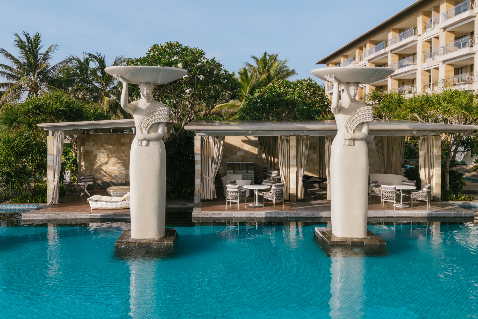 Water plays an important role throughout the Mulia Bali landscape design. Flowing pools, fountains, and reflective surfaces create continuity between spaces while contributing to a calm atmosphere.