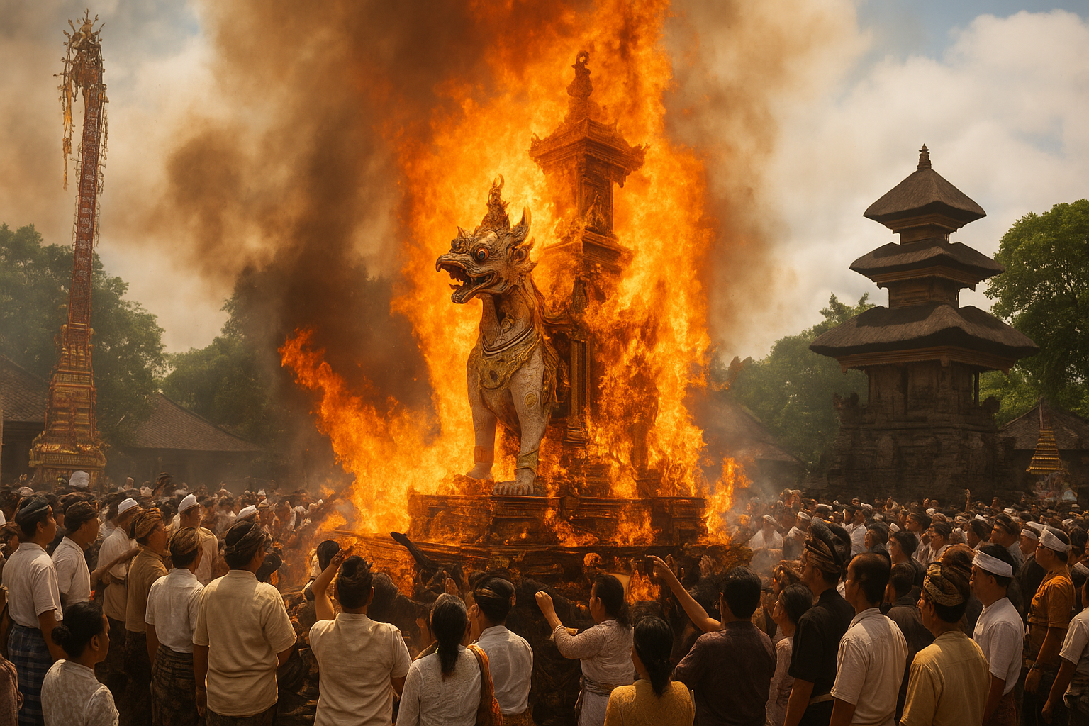 Death in Bali is not seen as an end, but as a magnificent transformation. The Ngaben cremation ceremony is perhaps the most spectacular of all life-cycle rituals. Families construct elaborate funeral towers (wadah) and animal-shaped sarcophagi (lembu), in which the deceased is carried to the cremation site. The body is burned, releasing the soul from its earthly vessel so it may continue its journey toward reincarnation or ultimate liberation (moksha).